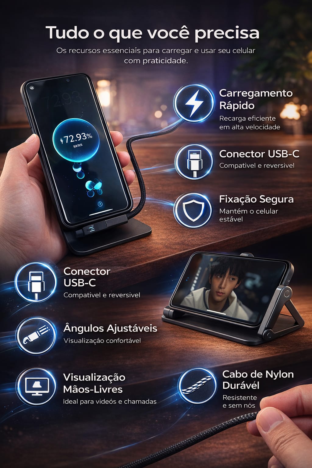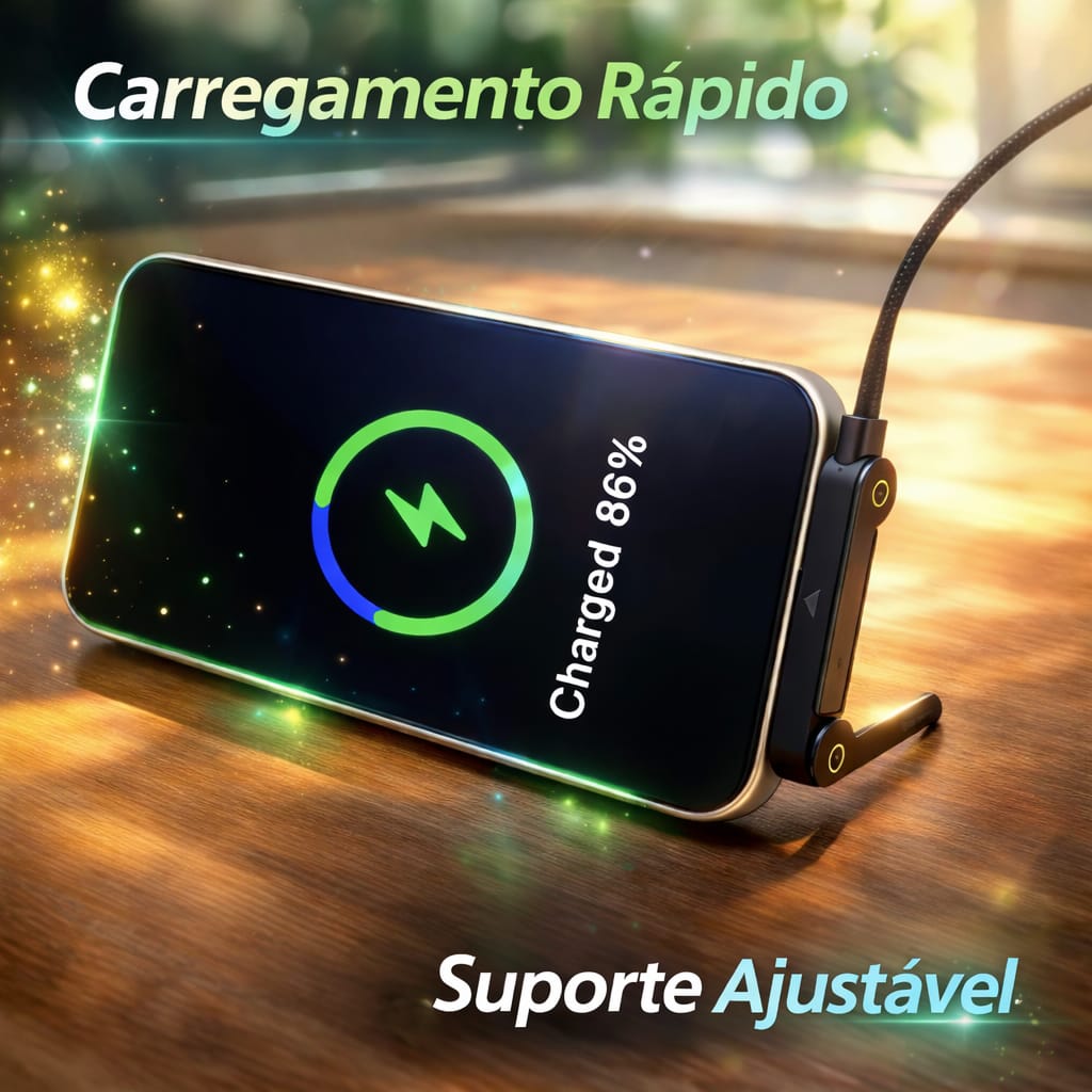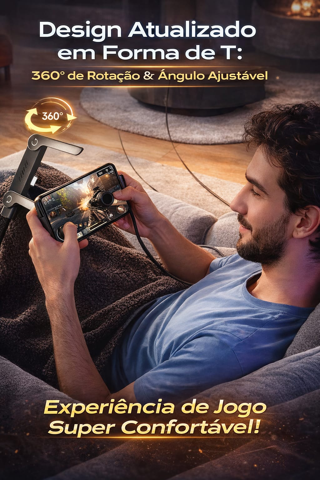 Carregue seu celular enquanto joga, assiste vídeos ou trabalha, mantendo o aparelho apoiado com estabilidade e conforto por horas seguidas.