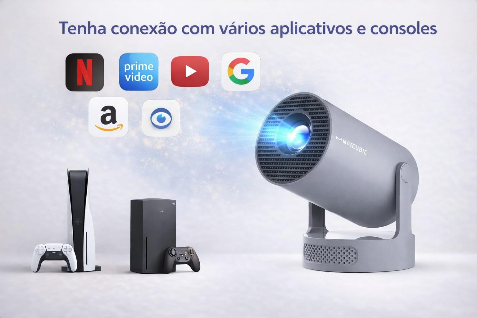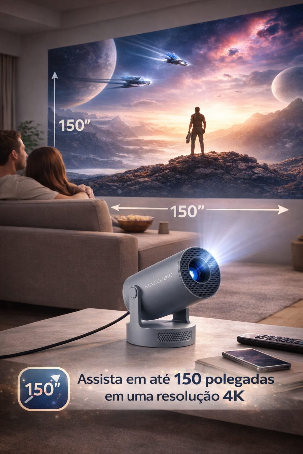 O CineBeam Ultra™ foi criado para quem quer viver uma experiência cinematográfica real sem gastar fortunas. Com projeção de até 150 polegadas e resolução Full HD com suporte 4K, ele entrega imagens nítidas, cores vivas e contraste elevado para transformar filmes, jogos e séries em um espetáculo visual.